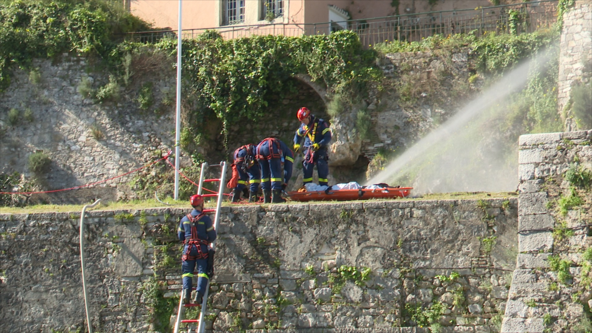 “Με τη συνδρομή των συναδέλφων έγινε η κατάσβεση, η πλήρης κατάσβεση της πυρκαγιάς και όλα πήγαν καλά. Η υπηρεσία μας ασκείται συνεχώς σε τέτοιου είδους συμβάντα. Θέλω να διευκρινίσω ότι αυτή είναι ετήσια άσκηση σεισμού πυρκαγιάς και δεν έγινε λόγω κάποιου επικείμενου σεισμού ή οτιδήποτε άλλο. Θέλω να ευχαριστήσω το Διοικητή του ΝΑΣΚΕ. Ο βαθμός δυσκολίας ήταν πολύ μεγάλος. Οι συνάδελφοι αναρριχήθηκαν με τη σκάλα στο τείχος του Nαυτικού Σταθμού, γιατί το σενάριο προέβλεπε ότι ο χώρος, η είσοδος του ναού και έχει πέσει από τον σεισμό και δεν υπάρχει καμία πρόσβαση πλην της πρόσβασης που έχετε καταγράψει και οι ίδιοι από το τοιχίο του ΝΑΣΚΕ και μέσω των φορητών κλιμάκων”.