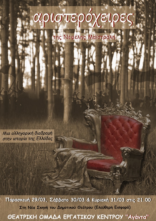 Η Θεατρική Ομάδα του Εργατικού Κέντρου Κέρκυρας «Αγάντα» παρουσιάζει το θεατρικό έργο «Αριστερόχειρες» της Νεφέλης Μαϊστράλη την Παρασκευή 29/3, το Σάββατο 30/3 και την Κυριακή 31/3 στις 9 μ.μ. στη Νέα Σκηνή του Δημοτικού Θεάτρου.