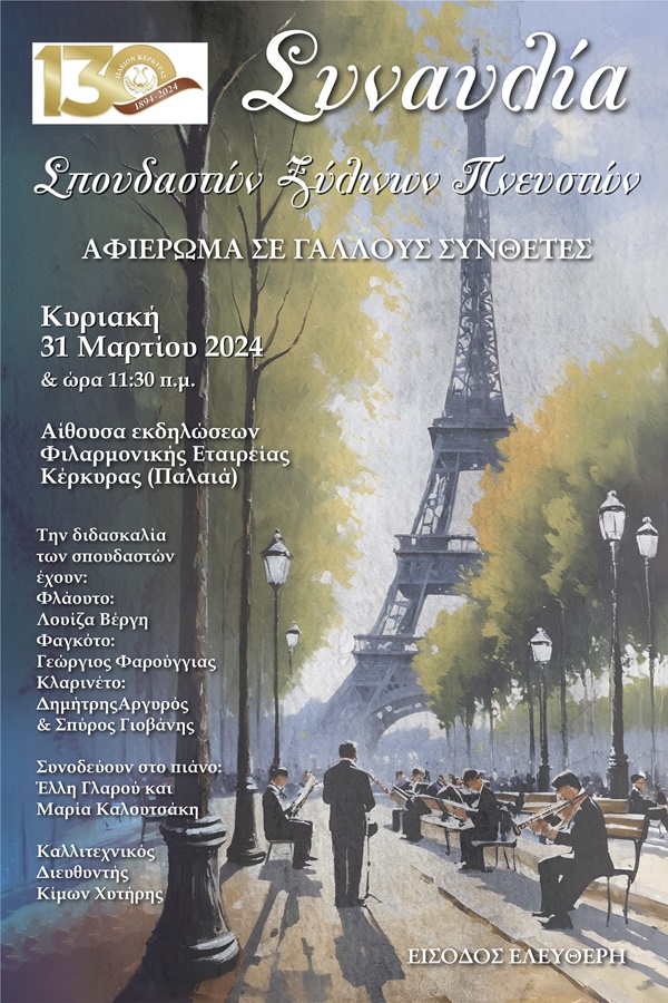 Την Κυριακή 31 Μαρτίου στις 11.30 π.μ. στην Αίθουσα Εκδηλώσεων της Φιλαρμονικής Εταιρείας Κέρκυρας (Παλαιά) θα πραγματοποιηθεί συναυλία των σπουδαστών της Σχολής Ξύλινων Πνευστών του Ωδείου Κερκύρας.