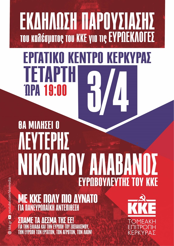 Η Τομεακή Επιτροπή Κέρκυρας του ΚΚΕ διοργανώνει στο Εργατικό Κέντρο Κέρκυρας, την Τετάρτη 3 Απριλίου, στις 19:00 εκδήλωση με θέμα: «Με το ΚΚΕ πολύ πιο δυνατό για πανευρωπαϊκή αντεπίθεση – Σπάμε τα δεσμά της ΕΕ! Για την Ελλάδα και την Ευρώπη του σοσιαλισμού, την Ευρώπη των εργατών, των αγροτών, των λαών».