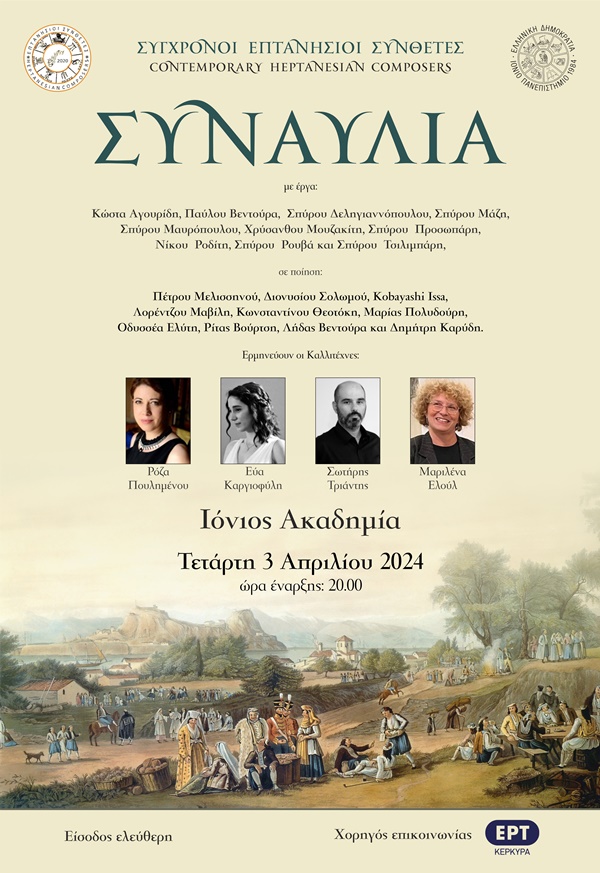 Το Τμήμα Μουσικών Σπουδών Ιονίου Πανεπιστημίου και η ομάδα των Σύγχρονων Επτανήσιων Συνθετών διοργανώνουν συναυλία μελοποιημένης ποίησης με έργα Κώστα Αγουρίδη, Παύλου Βεντούρα, Σπύρου Δεληγιαννόπουλου, Σπύρου Μάζη, Σπύρου Μαυρόπουλου, Χρύσανθου Μουζακίτη, Σπύρου Προσωπάρη, Νίκου Ροδίτη, Σπύρου Ρουβά και Σπύρου Τσιλιμπάρη, σε ποίηση Πέτρου Μελισσηνού, Kobayashi Issa, Διονυσίου Σολωμού, Λορέντζου Μαβίλη, Κωνσταντίνου Θεοτόκη, Μαρίας Πολυδούρη, Οδυσσέα Ελύτη, Ρίτας Βούρτση, Λήδας Βεντούρα και Δημήτρη Καρύδη.