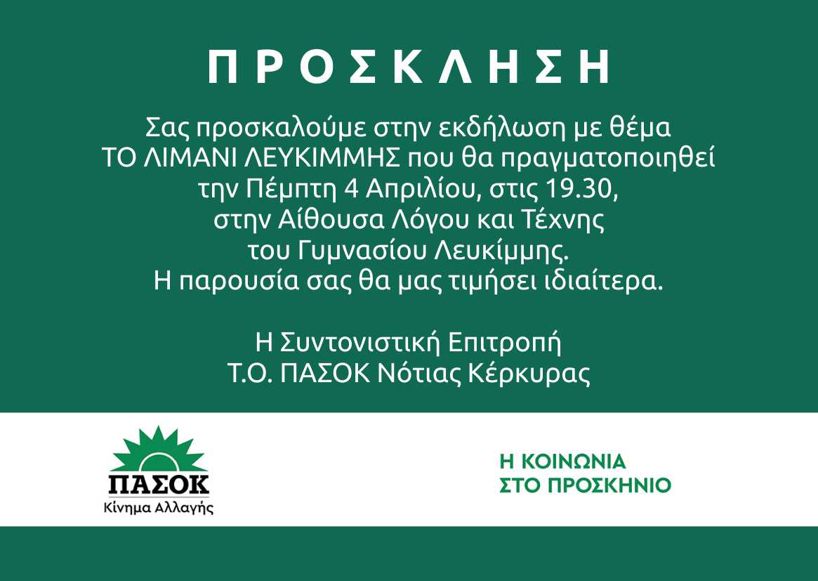 Εκδήλωση με θέμα το Λιμάνι της Λευκίμμης θα διοργανώσει το ΠΑΣΟΚ Νότιας Κέρκυρας την προσεχή Πέμπτη στις 7.30 το απόγευμα.