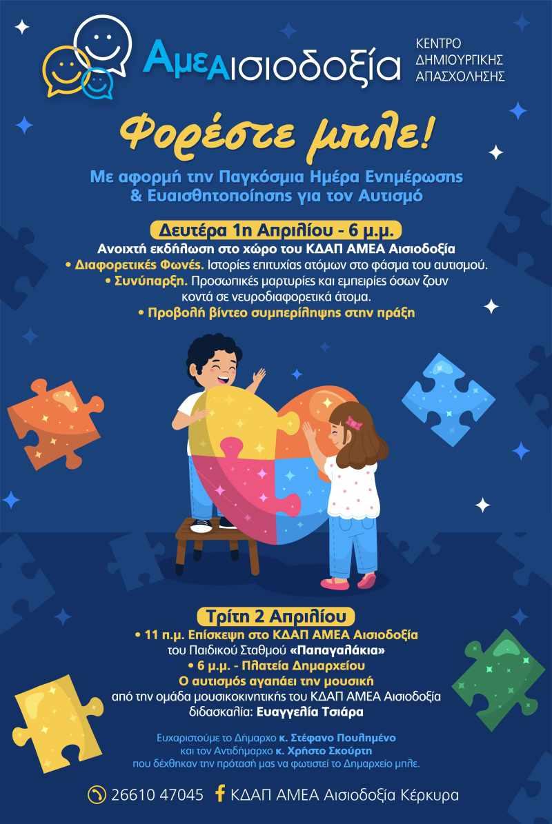 Το Κδαπ Αμεα Αισιοδοξία Κέρκυρας σας ενημερώνει για τον αυτισμό και να σας καλεί να συμβάλετε στην ευαισθητοποίηση και την ένταξη των αυτιστικών ατόμων στην κοινωνία. Ο αυτισμός δεν είναι εμπόδιο για την εκπαίδευση, την εργασία, την δημιουργικότητα και την ευτυχία. Με την κατάλληλη υποστήριξη, την κατανόηση και την αγάπη, τα αυτιστικά άτομα μπορούν να αναπτύξουν τις δυνατότητές τους και να συνεισφέρουν στην κοινωνική πρόοδο.