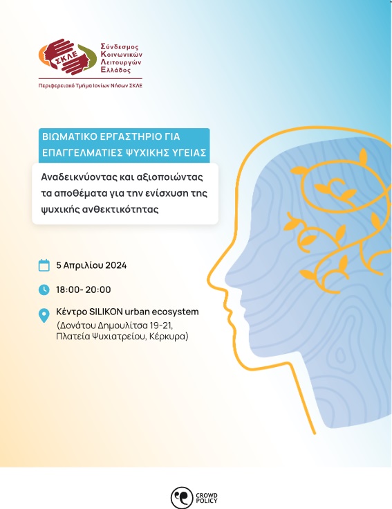 Το Περιφερειακό Τμήμα Ιονίων Νήσων του Σύνδεσμος Κοινωνικών Λειτουργών Ελλάδας, σε συνεργασία με το Κέντρο Πρόληψης και Προαγωγής της Ψυχοκοινωνικής Υγείας ΠΕ Ζακύνθου ΣΤΟΡΓΗ, διοργανώνει την Παρασκευή 5 Απριλίου 18:00- 20:00 , στο Κέντρο SILIKON urban ecosystem, (Δονάτου Δημουλίτσα 19-21, Πλατεία Ψυχιατρείου) Κέρκυρα, βιωματικό σεμινάριο αυτοφροντίδας για επαγγελματίες Ψυχικής Υγείας με θέμα: