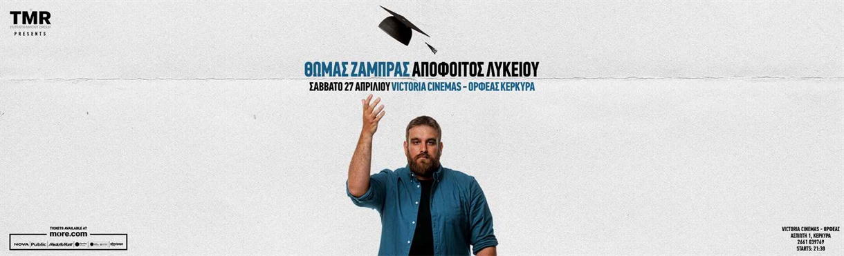 Ο Θωμάς Ζάμπρας επιστρέφει με την άκρως επιτυχημένη του παράσταση “Απόφοιτος Λυκείου” για μία μοναδική βραδιά στα Victoria Cinemas Κέρκυρας. Ο τίτλος είναι εμπνευσμένος από την περηφάνια του που ανήκει σε μια από τις πιο παρεξηγημένες μειονότητες: Απόφοιτος Λυκείου. Ανοίξαμε και σας περιμένουμε. Σύντομα κοντά σας. Ερχόμαστε στο χώρο σας. Μόνο σοβαρές προτάσεις.