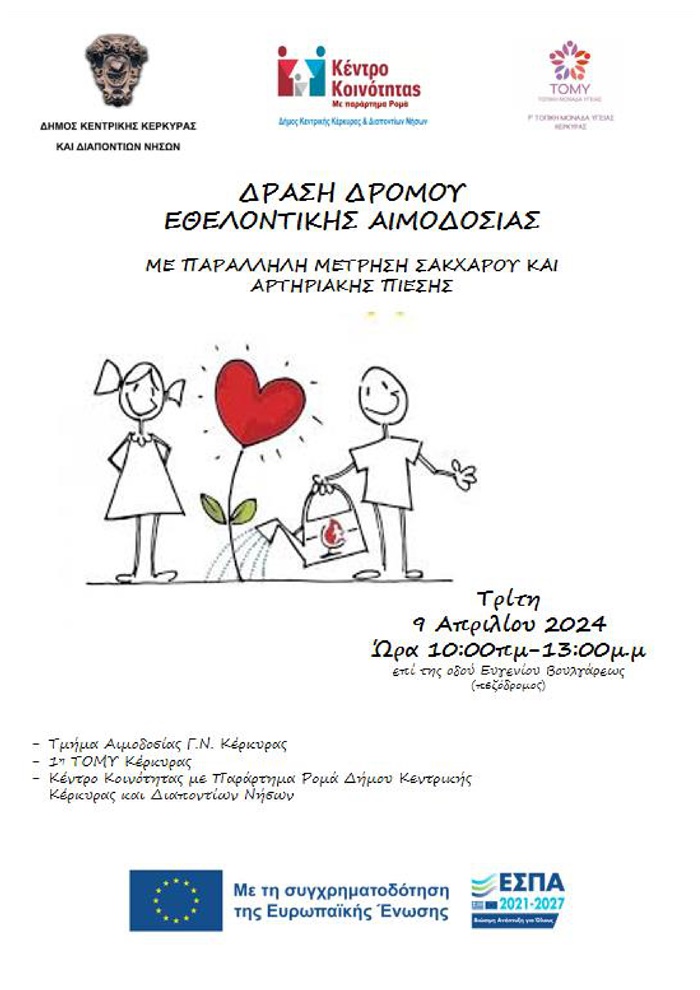 Το Κέντρο Κοινότητας με Παράρτημα Ρομά διοργανώνει δράση δρόμου εθελοντικής αιμοδοσίας σε συνδιοργάνωση με το Τμήμα Αιμοδοσίας του Γ.Ν. Κέρκυρας και την 1η ΤΟ.Μ.Υ. Κέρκυρας.