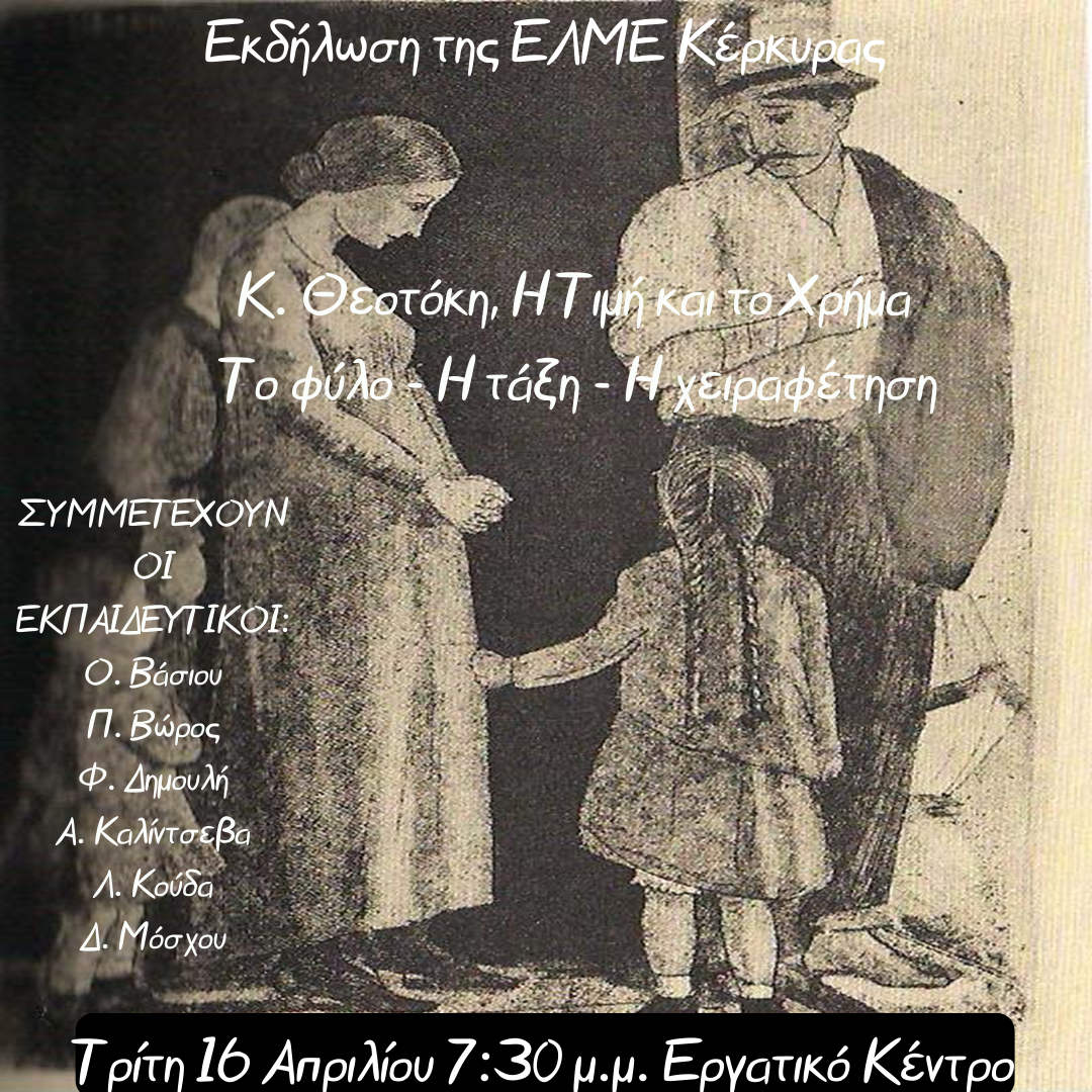 Η ΕΛΜΕ Κέρκυρας οργανώνει εκδήλωση-αφιέρωμα στο εμβληματικό έργο του Κωνσταντίνου Θεοτόκη «Η Τιμή και το Χρήμα», που θα γίνει στο Εργατικό Κέντρο, την Τρίτη 16 Απριλίου 2024, ώρα 7.30 μμ.