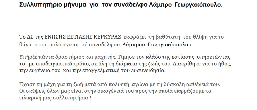 ΚΟΙΝΩΝΙΑΕΛΕΥΘΕΡΟΕΙΔΗΣΕΙΣ Συλλυπητήρια της Ένωσης Εστίασης για το χαμό του Λ. Γεωργακόπουλου Συλλυπητήριο μήνυμα εξέδωσε η Ένωση Εστίασης Κέρκυρας για το θάνατο του Λάμπρου Γεωργακόπουλου. Last updated: 14/04/2024 15:25 CorfuPress.com Published: 14/04/2024 Share SHARE Συλλυπητήριο μήνυμα εξέδωσε η Ένωση Εστίασης Κέρκυρας για το θάνατο του Λάμπρου Γεωργακόπουλου. Ένωση Εστίασης: Απογοήτευση από τις εξαγγελίες Μητσοτάκη Ένωσης Εστίασης: Καταδικάζει τις απειλές, στηρίζει τον Αντιδήμαρχο εμπορίου Ένωσης Εστίασης: Καταδικάζει τις απειλές, στηρίζει τον Αντιδήμαρχο εμπορίου Συγκροτήθηκε σε σώμα το νέο ΔΣ της Ένωσης Εστίασης Κέρκυρας Ολοήμερο το κλείσιμο της εστίασης στην Κέρκυρα την Παρασκευή… Share This Article Facebook Whatsapp Whatsapp Email Copy Link Print Previous Article «Ασημένιοι» οι Νέοι του Ιόνιου στο F4 της Κέρκυρας! Next Article Νίκη στα χαρτιά για τον Αστέρα, έχασε από τον πρωτοπόρο η ΑΕΛ! Δεν υπάρχουν Σχόλια Δεν υπάρχουν Σχόλια Αφήστε μια απάντηση Ακύρωση απάντησηςΗ ηλ. διεύθυνση σας δεν δημοσιεύεται. Τα υποχρεωτικά πεδία σημειώνονται με *Σχόλιο * Όνομα * Email * Ιστότοπος Αποθήκευσε το όνομά μου, email, και τον ιστότοπο μου σε αυτόν τον πλοηγό για την επόμενη φορά που θα σχολιάσω. ΑναζήτησηΑναζήτησηRecent PostsΌλα τα μάτια στον Θοδωρή, τον καπετάνιο μας! Τη Δευτέρα 22 Σεπτεμβρίου γιορτάζει… Σαν Σήμερα 22/9: Τα σημαντικότερα γεγονότα… Η πρόγνωση του καιρού Έφηβοι Ιονίου: Με περίπατο, συνεχίζουν στο Rising Stars! Recent CommentsΧωρίς σχόλια για εμφάνιση.