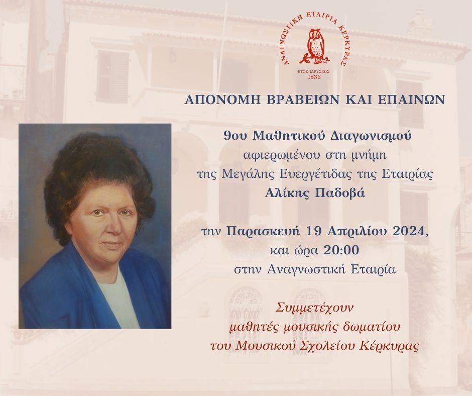 Η Αναγνωστική Εταιρία Κερκύρας διοργανώνει την απονομή των βραβείων και επαίνων του 9ου Μαθητικού Διαγωνισμού αφιερωμένου στη μνήμη της Μεγάλης Ευεργέτιδας Αλίκης Παδοβά, που θα πραγματοποιηθεί στην αίθουσα εκδηλώσεων της Εταιρίας, την Παρασκευή 19 Απριλίου 2024, και ώρα 20:00.