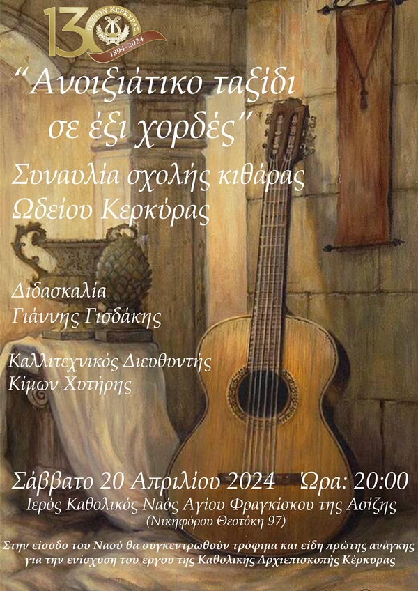 Το Σάββατο 20 Απριλίου 2024 θα δοθεί η συναυλία των ανωτέρων τάξεων της Σχολής Κιθάρας του Ωδείου Κερκύρας στον Ιερό Καθολικό Ναό του Αγίου Φραγκίσκου της Ασίζης (Νικηφόρου Θεοτόκη 97).