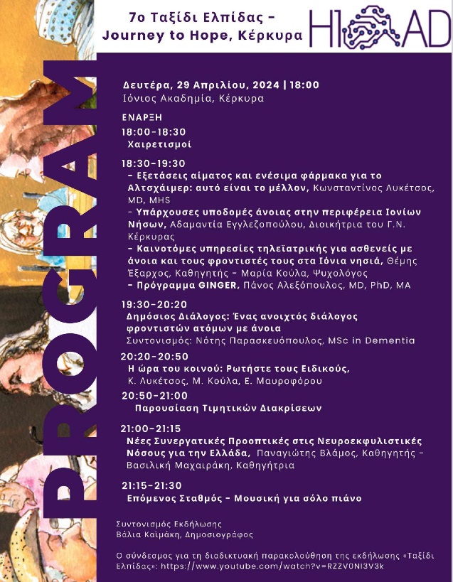 Τη Δευτέρα 29/04 στις 18:30 θα φιλοξενηθεί στην Ιόνιο Ακαδημία ενημερωτική εκδήλωση για την άνοια και τις νευροεκφυλιστικές νόσους με τίτλο «7ο Ταξίδι Ελπίδας – Journey to Hope». Την εκδήλωση συνδιοργανώνει η Ελληνική Πρωτοβουλία Ενάντια στην Αλτσχάιμερ, το Εργαστήριο Βιοπληροφορικής και Ανθρώπινης Ηλεκτροφυσιολογίας (BIHELab) του Ιονίου Πανεπιστημίου και το Κέντρο Αριστείας Ιατρικής Ακριβείας για τη νόσο Αλτσχάιμερ, του Πανεπιστημίου Johns Hopkins.