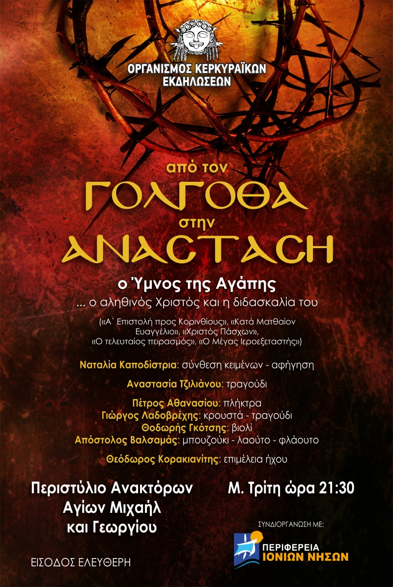 -Nα παρακολουθήσετε την καθιερωμένη ποιητική – μουσική βραδιά “Από το Γολγοθά στην Ανάσταση” που θα πραγματοποιηθεί τη Μεγάλη Τρίτη 30-4-2024 στις 21:30΄στο Περιστύλιο του Ανακτόρου των Αγίων Μιχαήλ και Γεωργίου
