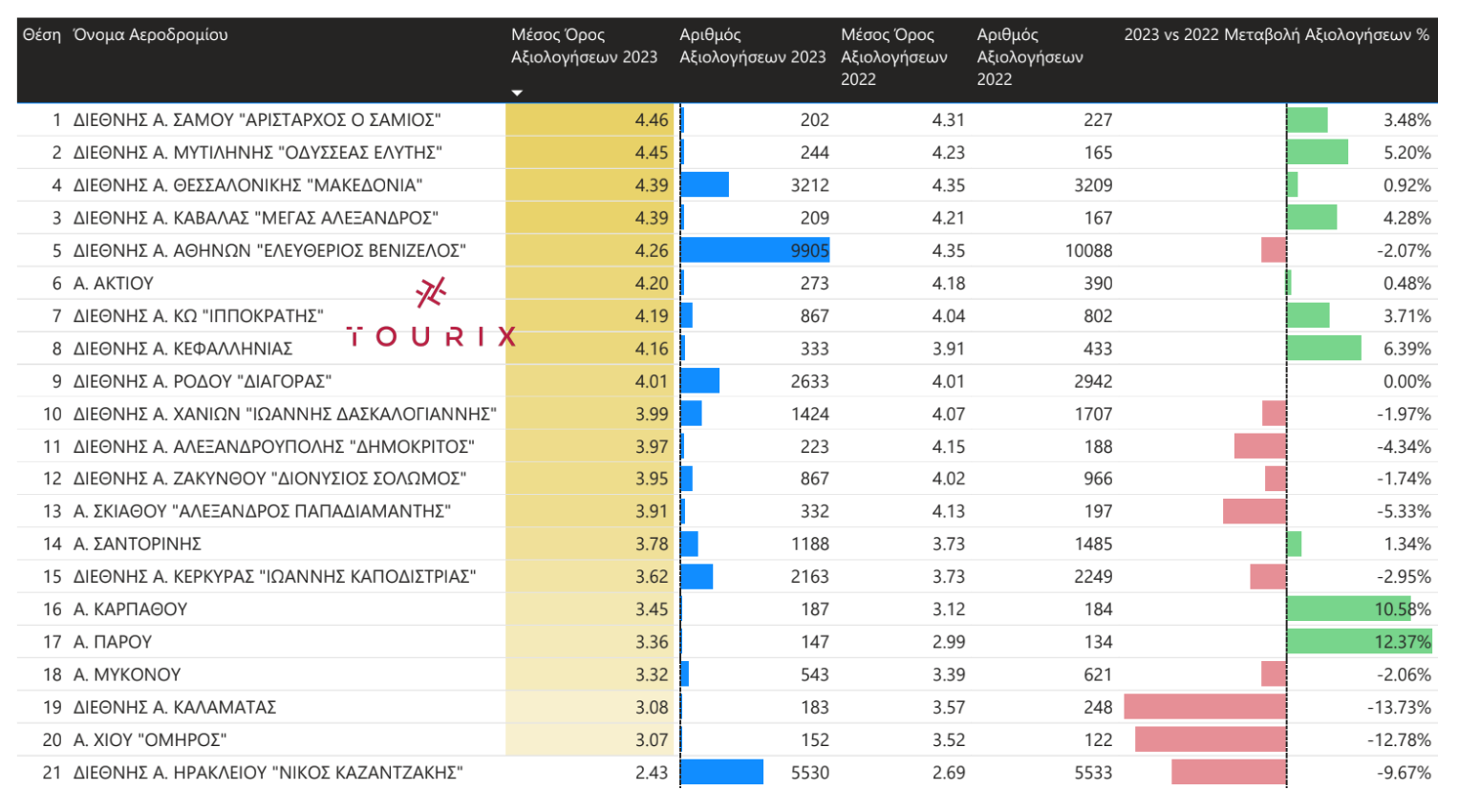 Αντίθετα, τα αεροδρόμια της Καλαμάτας, της Χίου, του Ηρακλείου και της Σκιάθου κατέγραψαν τη μεγαλύτερη αρνητική ετήσια ποσοστιαία μεταβολή στη βαθμολογία των αξιολογήσεών τους.