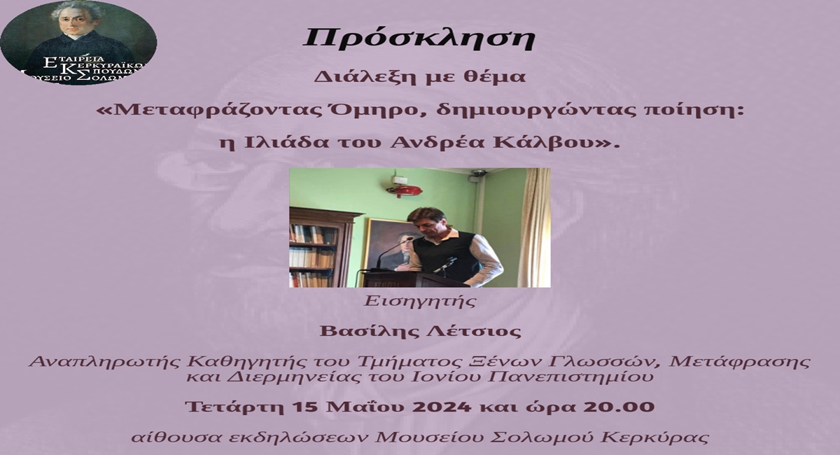 Στο πλαίσιο των ομιλιών αυτών πραγματοποιείται την Τετάρτη 15 Μαΐου 2024 και ώρα 20.00 ομιλία του κ. Βασίλη Λέτσιου, Αναπληρωτή Καθηγητή του Τμήματος Ξένων Γλωσσών, Μετάφρασης και Διερμηνείας του Ιονίου Πανεπιστημίου, με τίτλο: «Μεταφράζοντας Όμηρο, δημιουργώντας ποίηση: η Ιλιάδα του Ανδρέα Κάλβου».