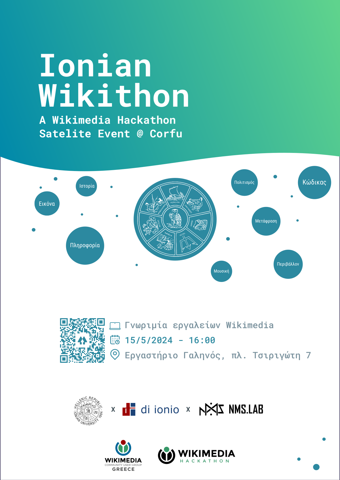 Ανακοινώνουμε την διεξαγωγή του 3ου Ionian Wikithon 2024, ενός Wikimedia Hackathon Satellite event, στην Κέρκυρα το οποίο πραγματοποιείται από το Εργαστήριο Δικτύων, Πολυμέσων και Ασφάλειας Συστημάτων (NMSLab) του Τμήματος Πληροφορικής του Ιονίου Πανεπιστημίου σε συνεργασία με το Wikimedia Community User Group Greece και το Σύλλογο Wikimedia Ελλάδας.