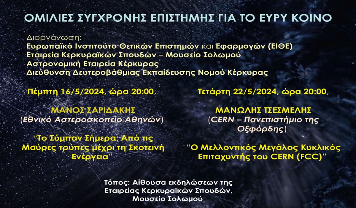 Το Ευρωπαϊκό Ινστιτούτο Θετικών Επιστημών και Εφαρμογών (ΕΙΘΕ), η Εταιρεία Κερκυραϊκών Σπουδών – Μουσείο Σολωμού, η Αστρονομική Εταιρεία Κέρκυρας και η Διεύθυνση Δευτεροβάθμιας Εκπαίδευσης Νομού Κέρκυρας διοργανώνουν δυο εκλαϊκευμένες ομιλίες στο χώρο του Μουσείου Σολωμού.