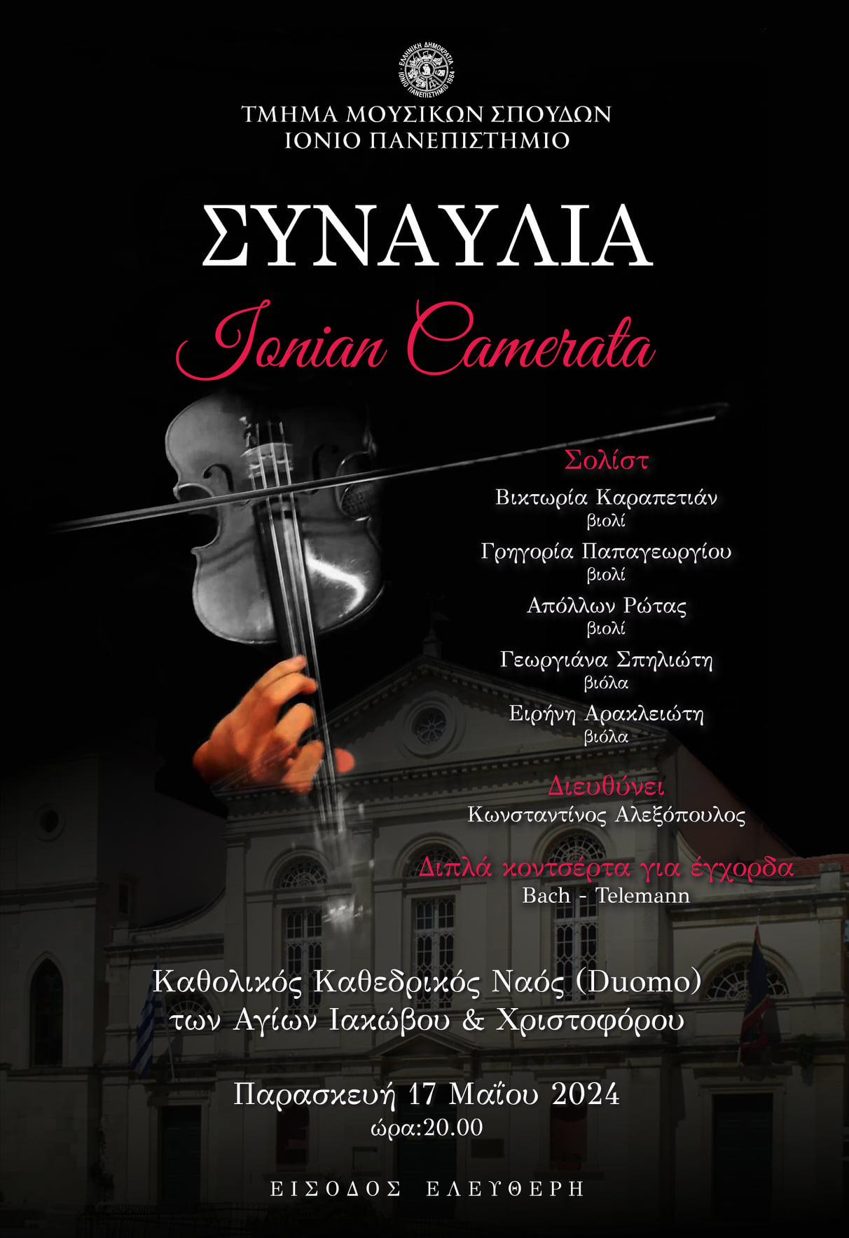 Συναυλία της Ionian Camerata (διδασκαλία Σ.Γκικόντης) του Τμήματος Μουσικών Σπουδών Ιονίου Πανεπιστημίου στον Καθολικό Μητροπολιτικό Ναό Αγίου Ιακώβου και Χριστοφόρου (Duomo) την Παρασκευή, 17 Μαΐου, ώρα 20.00.