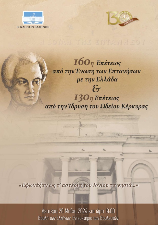 Το Ωδείο Κέρκυρας, με αφορμή την συμπλήρωση 160 χρόνων από την Ένωση των Επτανήσων με την Ελλάδα (1864 – 2024) και 130 χρόνων από την Ίδρυσή του (1894 – 2024), θα παρουσιάσει στη Βουλή των Ελλήνων, την παράσταση: “Eφωνάξαν ως τ’ αστέρια του Ιονίου τα νησιά…”