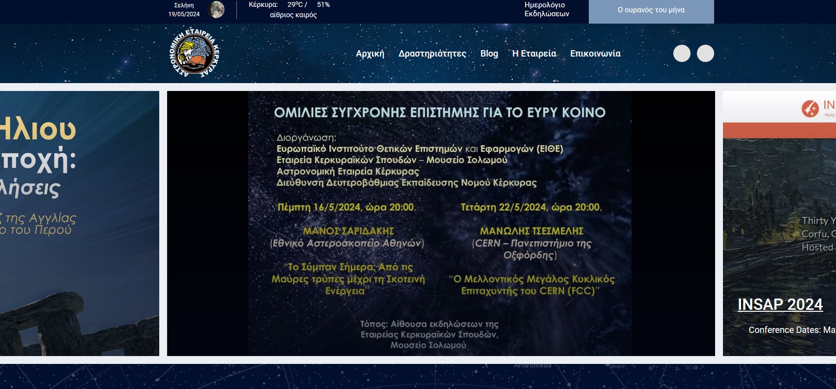 Η Αστρονομική Εταιρεία Κέρκυρας, ενημερώνει τους φίλους της, για την ανανέωση και επαναλειτουργία της ιστοσελίδας της, μέσω της οποίας μπορείτε να ενημερώνεστε για τις εκδηλώσεις της, όπως και για άλλα σημαντικά νέα και ανακοινώσεις της αστρονομικής και επιστημονικής κοινότητας.