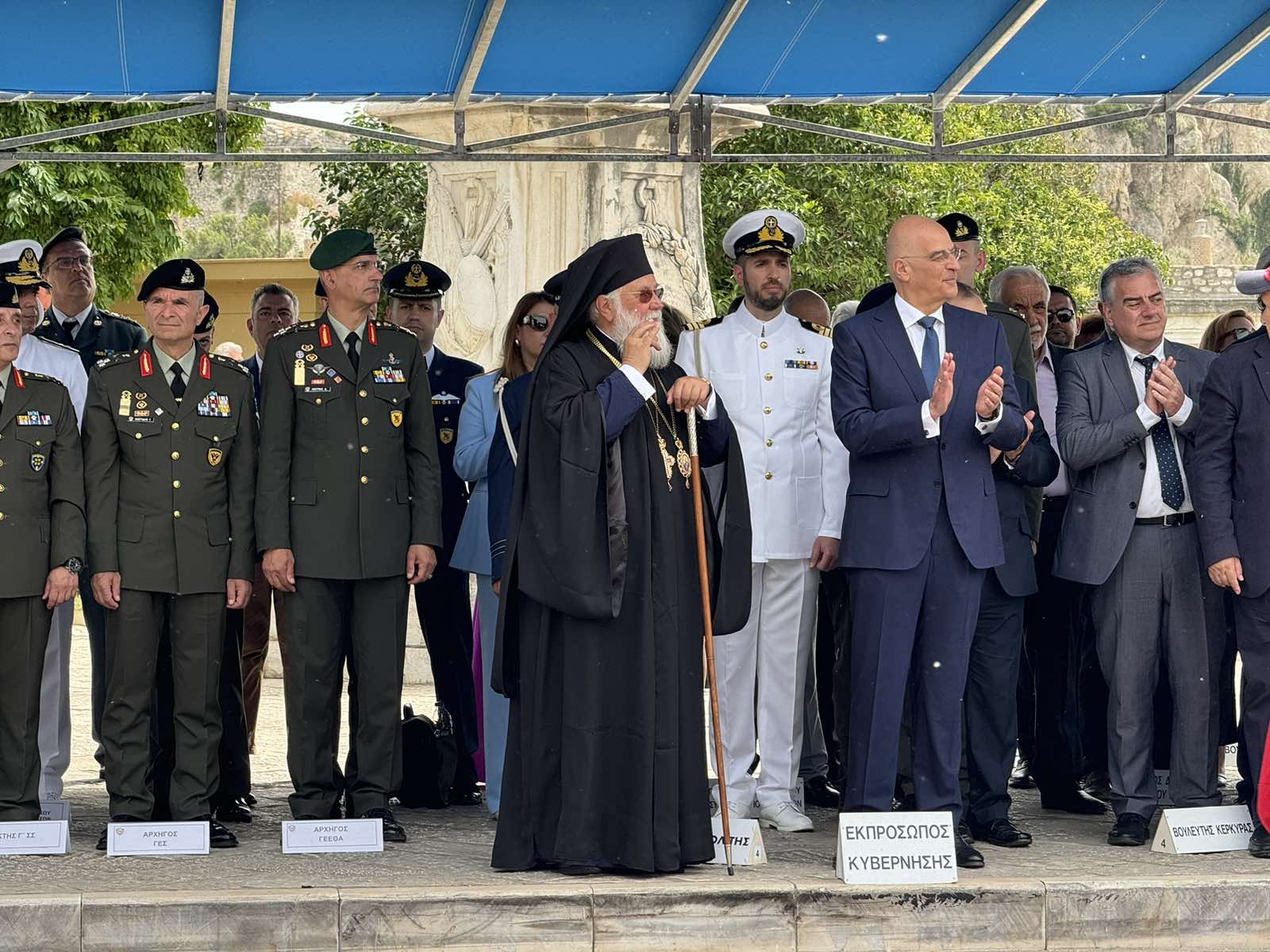 Κατόπιν, ο κ. Νεκτάριος τέλεσε επιμνημόσυνη δέηση στο Μνημείο της Ένωσης των Επτανήσων στην μνήμη του πρωτεργάτου της Ενώσεως μακαριστού Μητροπολίτου Κερκύρας Αθανασίου Πολίτου και των αγωνιστών Κερκυραίων και άλλων Επτανησίων, παρουσία του Υπουργού, των αρχηγών των Ενόπλων Δυνάμεων και όλων των αρχών της Κέρκυρας.