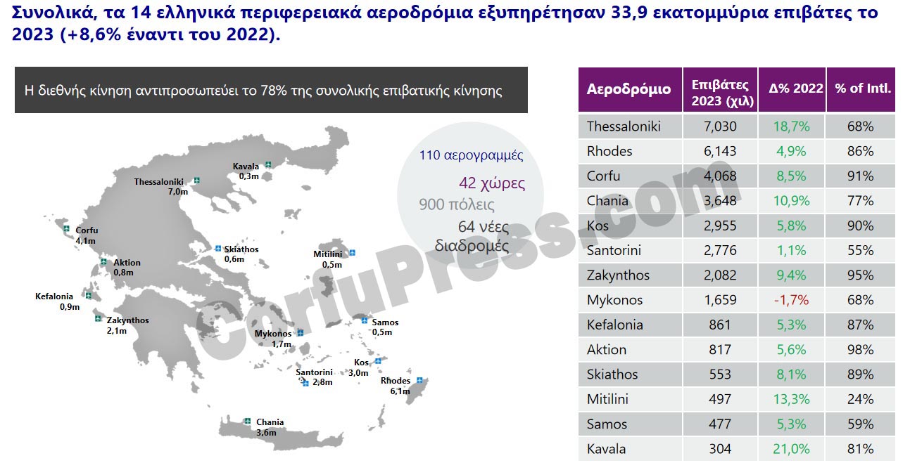 Αναφέρθηκε στη βελτίωση των υποδομών ώστε να μπορεί το αεροδρόμιο να εξυπηρετεί περισσότερα και μεγαλύτερα αεροσκάφη. Μάλιστα, έκανε λόγο για ρεκόρ όλων των εποχών το 2023 όσον αφορά τους επιβάτες που εξυπηρέτησε (ξεπέρασαν κατά 70.000 τα 4 εκατομμύρια (!) αφίξεις και αναχωρήσεις, κάτι που σημαίνει ότι μέσω του Ι. Καποδίστριας, έφτασαν στο νησί πάνω από 2.000.000 άτομα από Ελλάδα και Εξωτερικό) ενώ και οι προβλέψεις για το 2024 είναι ιδιαίτερα ευοίωνες, αφού οι προκρατήσεις στα slots από τις αεροπορικές αλλά και η περαιτέρω αύξηση των συνδέσεων με πόλεις του εξωτερικού προμηνύουν κάτ τέτοιο.