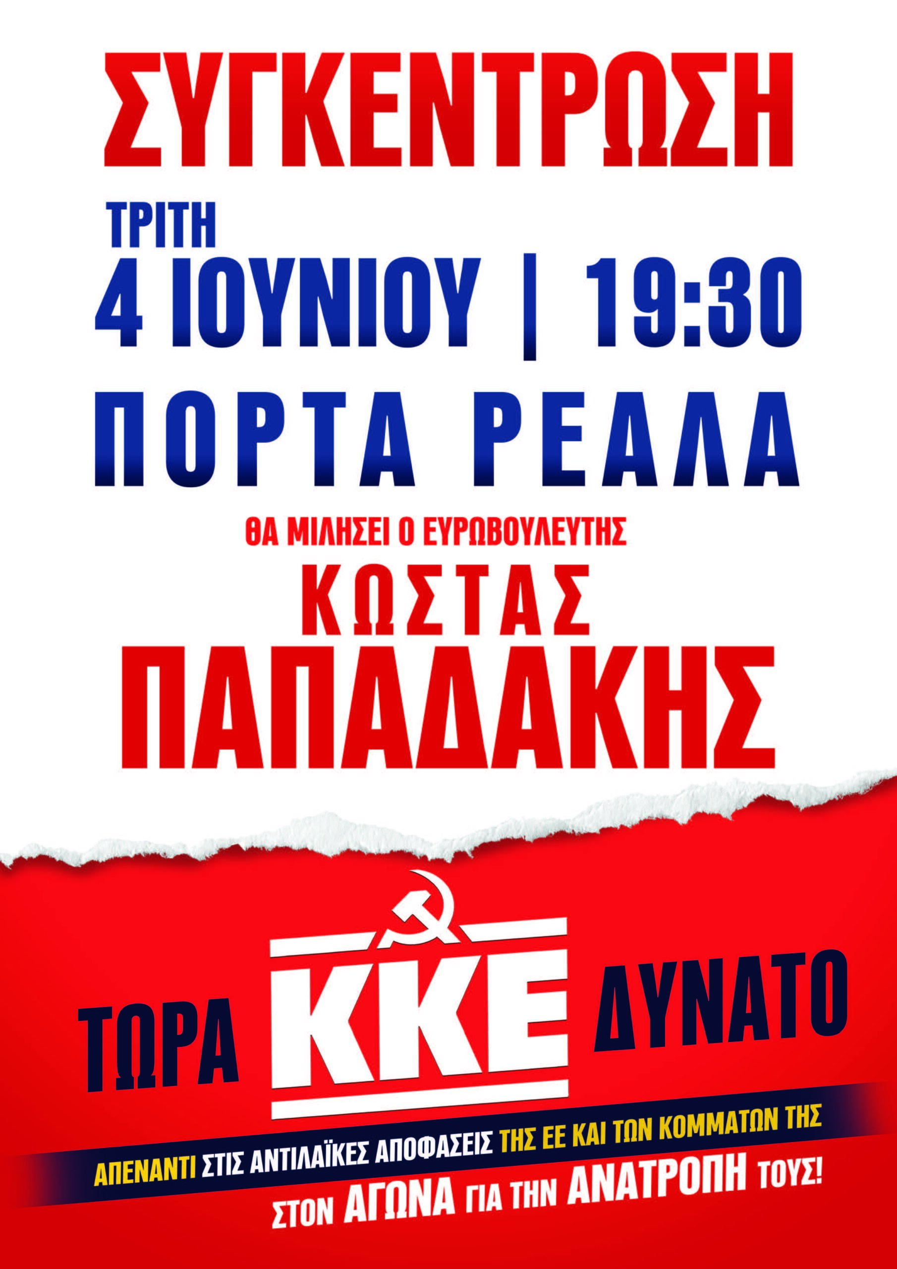 Η Τομεακή Επιτροπή Κέρκυρας του ΚΚΕ διοργανώνει την κεντρική προεκλογική συγκέντρωση του Κόμματος για τις ευρωεκλογές, την Τρίτη 4 Ιουνίου στις 19:30 στην Πόρτα Ριάλα. Θα μιλήσει ο ευρωβουλευτής του ΚΚΕ και εκ νέου υποψήφιος Κώστας Παπαδάκης.