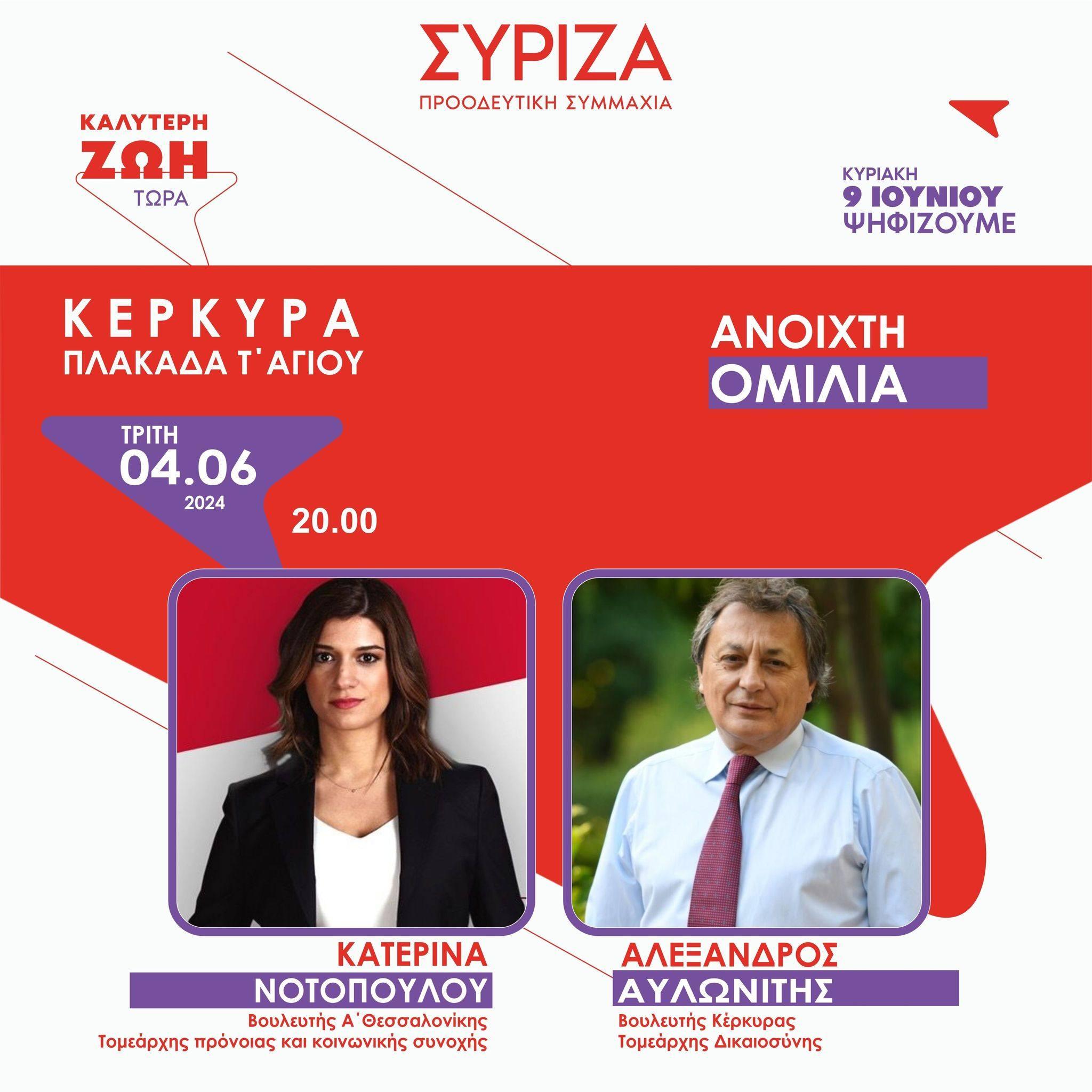Σας προσκαλούμε στην κεντρική προεκλογική εκδήλωση του ΣΥΡΙΖΑ-Π.Σ. Κέρκυρας για τις Ευρωεκλογές 2024, που θα πραγματοποιηθεί αύριο Τρίτη 4 Ιουνίου 2024 και ώρα 8 μ.μ. στην Πλακάδα.