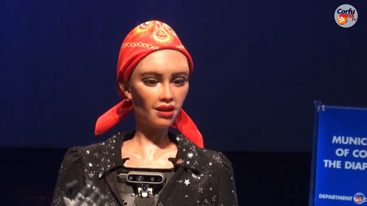 Το ρομπότ εμφανίστηκε με… κερκυραϊκή «τσουτσουμίδα» στο κεφάλι, ενώ, μεταξύ άλλων, απάντησε σε ερωτήσεις των δημοσιογράφων.