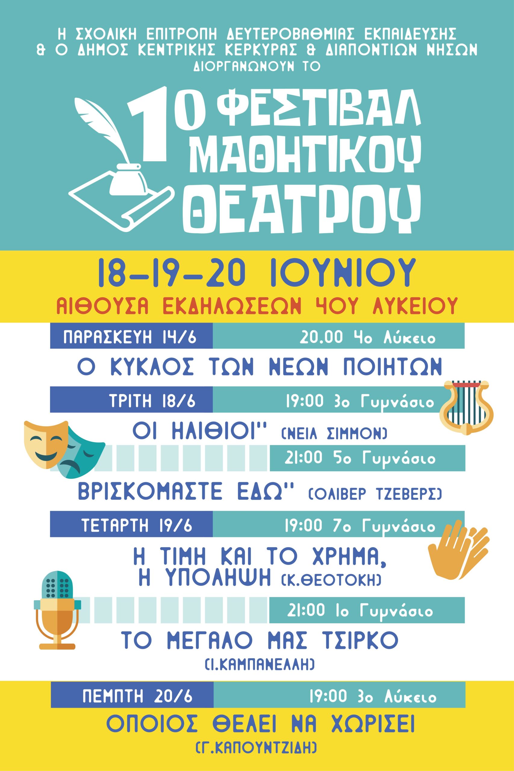 Η Σχολική Επιτροπή Δευτεροβάθμιας Εκπαίδευσης (Σ.Ε.Δ.Ε.) του Δήμου Κεντρικής Κέρκυρας & Δ.Ν, σε συνεργασία με το Δήμο Κεντρικής Κέρκυρας & Δ.Ν, συνδιοργανώνει το 1ο ΜΑΘΗΤΙΚΟ ΦΕΣΤΙΒΑΛ ΘΕΑΤΡΟΥ.