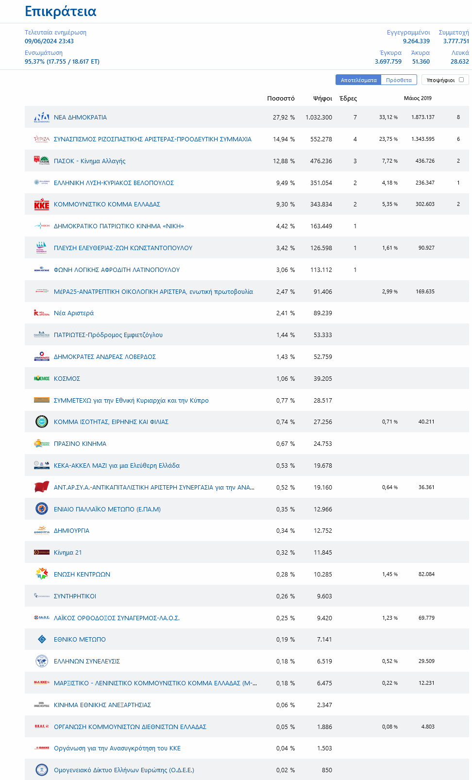 ΠΟΛΙΤΙΚΗΠΟΛΙΤΙΚΗΕΙΔΗΣΕΙΣ Ευρωεκλογές/Επικράτεια (στο 95,37%): ΝΔ 27,92%, ΣΥΡΙΖΑ 14,94%, ΠΑΣΟΚ 12,88% Δείτε τα αποτελέσματα των ευρωεκλογών στην Επικράτεια. Last updated: 06/10/2025 12:18 CorfuPress.com Published: 09/06/2024 Share SHARE Δείτε τα αποτελέσματα των ευρωεκλογών στην Επικράτεια. Το “ευχαριστώ” του Δημήτρη Μεταλληνού Το “ευχαριστώ” του Δημήτρη Μεταλληνού Πλεύση Ελευθερίας: Το δεύτερο μεγαλύτερο ποσοστό στην Κέρκυρα ΣΥΡΙΖΑ: Στην Κέρκυρα, το τρίτο ψηλότερο ποσοστό… Οι επιδόσεις των Κερκυραίων υποψήφιων Ευρωβουλευτών Share This Article Facebook Whatsapp Whatsapp Email Copy Link Print Previous Article Το τελικό exit poll: 27-31% ΝΔ, 13,8-17,2% ΣΥΡΙΖΑ και 11,5-14,5% ΠΑΣΟΚ Next Article Πανευρωπαϊκό Exit Poll: Πρώτο το Λαϊκό Κόμμα, δεύτερη δύναμη τα δύο κόμματα της ακροδεξιάς Δεν υπάρχουν Σχόλια Δεν υπάρχουν Σχόλια Αφήστε μια απάντηση Ακύρωση απάντησηςΗ ηλ. διεύθυνση σας δεν δημοσιεύεται. Τα υποχρεωτικά πεδία σημειώνονται με *Σχόλιο * Όνομα * Email * Ιστότοπος Αποθήκευσε το όνομά μου, email, και τον ιστότοπο μου σε αυτόν τον πλοηγό για την επόμενη φορά που θα σχολιάσω. ΑναζήτησηΑναζήτησηRecent PostsΌλα τα μάτια στον Θοδωρή, τον καπετάνιο μας! Τη Δευτέρα 22 Σεπτεμβρίου γιορτάζει… Σαν Σήμερα 22/9: Τα σημαντικότερα γεγονότα… Η πρόγνωση του καιρού Έφηβοι Ιονίου: Με περίπατο, συνεχίζουν στο Rising Stars! Recent CommentsΧωρίς σχόλια για εμφάνιση.