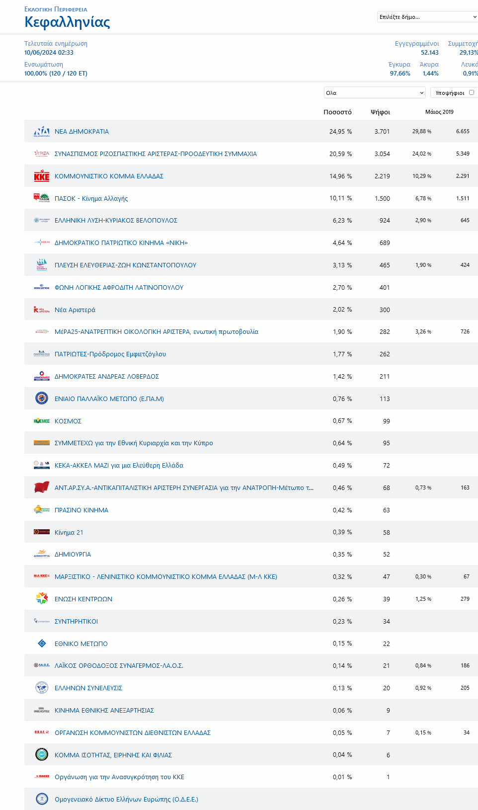 ΠΟΛΙΤΙΚΗΠΟΛΙΤΙΚΗΕΙΔΗΣΕΙΣ Ευρωεκλογές/Κεφαλονιά (τελικό): Νίκη για τη ΝΔ, δεύτερος ο ΣΥΡΙΖΑ, τρίτο το ΚΚΕ Η κυβερνητική παράταξη έλαβε 24,95%, ο ΣΥΡΙΖΑ 20,59%, ενώ το ΚΚΕ 14,96% Last updated: 06/10/2025 12:19 CorfuPress.com Published: 10/06/2024 Share SHARE Η κυβερνητική παράταξη έλαβε 24,95%, ο ΣΥΡΙΖΑ 20,59%, ενώ το ΚΚΕ 14,96% Έρχεται η 41η Χορωδιακή Συνάντηση Κεφαλονιάς Έρχεται η 41η Χορωδιακή Συνάντηση Κεφαλονιάς Μία σύλληψη για οδήγηση υπό την επήρεια μέθης, στην Κεφαλονιά Αποδομήθηκε εγκληματική ομάδα που δρούσε στην Κεφαλονιά Οδηγούσε μεθυσμένος στην Κεφαλονιά Share This Article Facebook Whatsapp Whatsapp Email Copy Link Print Previous Article Ευρωεκλογές/Λευκάδα (τελικό): Νίκη της ΝΔ, δεύτερο το ΠΑΣΟΚ Next Article ΝΔ: Το 5ο χαμηλότερο ποσοστό στην Κέρκυρα, στο top10 (και) Κεφαλονιά και Ζάκυνθος Δεν υπάρχουν Σχόλια Δεν υπάρχουν Σχόλια Αφήστε μια απάντηση Ακύρωση απάντησηςΗ ηλ. διεύθυνση σας δεν δημοσιεύεται. Τα υποχρεωτικά πεδία σημειώνονται με *Σχόλιο * Όνομα * Email * Ιστότοπος Αποθήκευσε το όνομά μου, email, και τον ιστότοπο μου σε αυτόν τον πλοηγό για την επόμενη φορά που θα σχολιάσω. ΑναζήτησηΑναζήτησηRecent PostsΌλα τα μάτια στον Θοδωρή, τον καπετάνιο μας! Τη Δευτέρα 22 Σεπτεμβρίου γιορτάζει… Σαν Σήμερα 22/9: Τα σημαντικότερα γεγονότα… Η πρόγνωση του καιρού Έφηβοι Ιονίου: Με περίπατο, συνεχίζουν στο Rising Stars! Recent CommentsΧωρίς σχόλια για εμφάνιση.