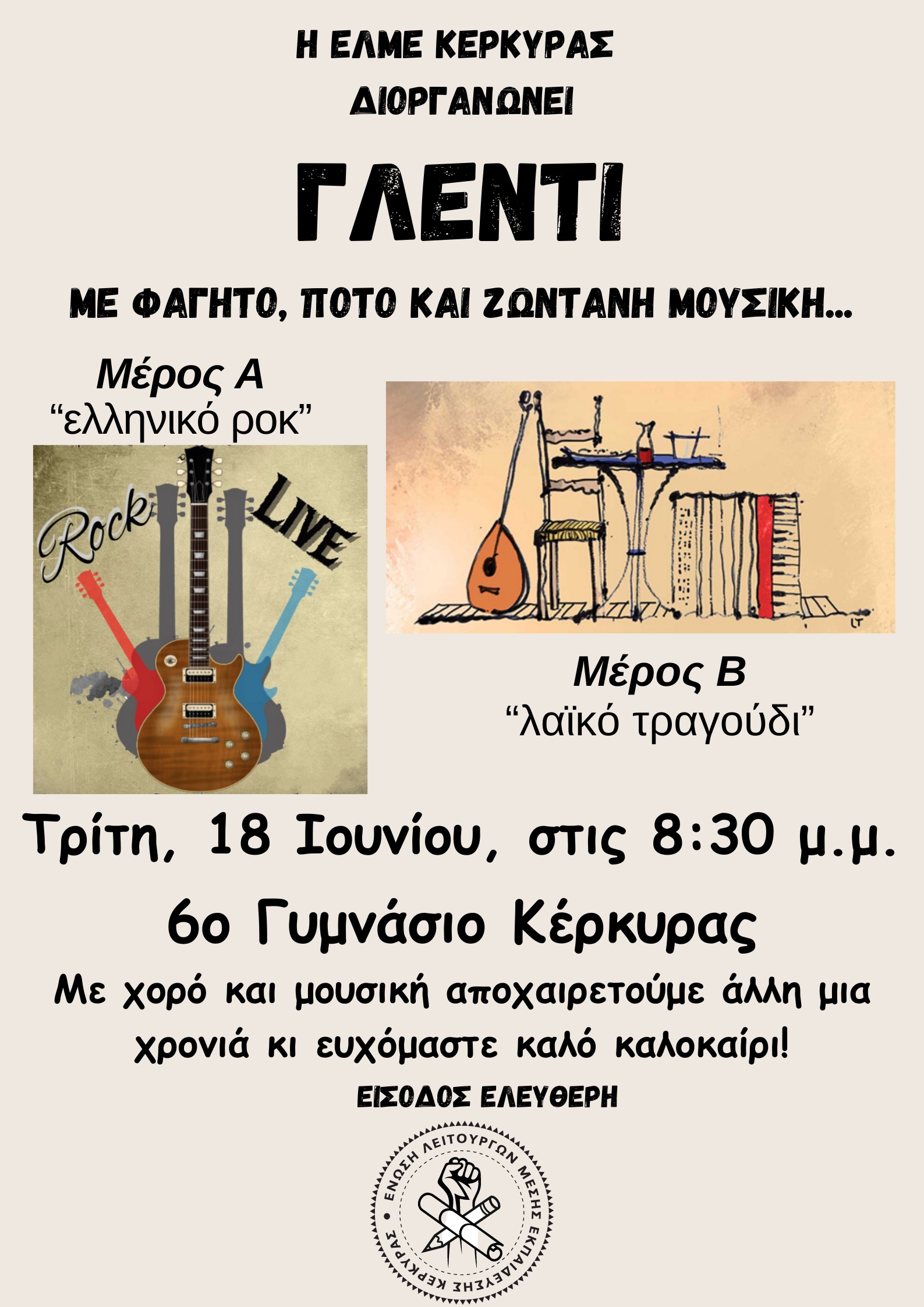 Η ΕΛΜΕ Κέρκυρας θα πραγματοποιήσει και φέτος το γλέντι της, την Τρίτη 18 Ιουνίου στο 6ο Γυμνάσιο Κέρκυρας και είστε όλες και όλοι καλεσμένοι!
