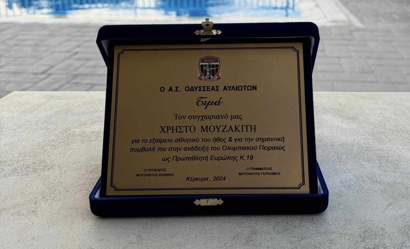 O AΣ OΔYΣΣEAΣ AΠENEIME TIMHTIKH ΠΛAKETA ΣTON ΠOΔOΣΦAIPIΣTH TOY OΛYMΠIAKOY ΠEIPAIΩΣ XPHΣTO MOYZAKITH ΓIA THN KATAKTHΣH TOY CHAMPIONS LEAGUE NEΩN K19 (UEFA youth league) KAI TON ΠPΩTAΓΩNIΣTIKO POΛO ΠOY EIXE ΣE OΛH TH ΔIAPKEIA AYTHΣ ΠOPEIAΣ.