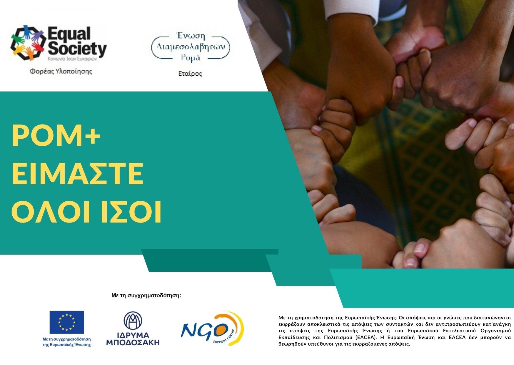 Ο Οργανισμός «Κοινωνία Ίσων Ευκαιριών» σε συνεργασία με την «Ένωση Ελλήνων Ρομά Διαμεσολαβητών και Συνεργατών» συνεχίζουν την επιτυχημένη λειτουργία του Παρατηρητηρίου Συνηγορίας και Προάσπισης των Ανθρωπίνων Δικαιωμάτων των Ρομά με το έργο «ΡΟΜ+: Είμαστε όλοι ίσοι» το οποίο υλοποιείται στο πλαίσιο του προγράμματος BUILD με τη συγχρηματοδότηση της Ευρωπαϊκή Ένωσης, του Ιδρύματος Μποδοσάκη και του Κέντρου Στήριξης ΜΚΟ Κύπρου.