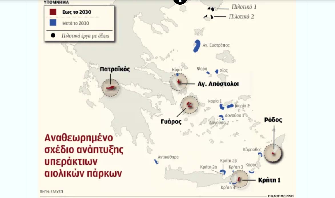 Στο ρεπορτάζ της Καθημερινής, υπογραμμίζεται ότι η Ε∆ΕΥΕΠ πιθανότατα και μέσα στο Σαββατοκύριακο τον επανασχεδιασμό των περιοχών. Σύμφωνα με πληροφορίες, οριστικά εκτός σχεδιασμού (μεσοπρόθεσμου και μακροπρόθεσμου) μένουν τα ∆ιαπόντια Νησιά στο Ιόνιο μετά τις αντιδράσεις των τοπικών κοινωνιών και φορέων της ευρύτερης περιοχής, ενώ οι δύο περιοχές βορειοανατολικώς της Κρήτης (Κρήτη 2α και Κρήτη 2β) βγαίνουν από την πρώτη φάση ανάπτυξης του εθνικού προγράμματος και μετατίθενται χρονικά για μετά το 2032, πιθανότατα και μετά το 2035. Στη συγκεκριμένη περιοχή μεταξύ Αγ. Νικολάου και Σητείας ο αρχικός σχεδιασμός προέβλεπε την εγκατάσταση αιολικών πάρκων συνολικής ισχύος 600 MW. Το ΥΠΕΝ επιδίωξε αρχικά να κάμψει τις αντιδράσεις που εκδηλώθηκαν από ξενοδόχους, δήμους και Περιφέρεια Κρήτης με τη συρρίκνωση και παράλληλη μετατόπιση των δύο οικοπέδων σε απόσταση που δεν υπήρχε οπτική όχληση.