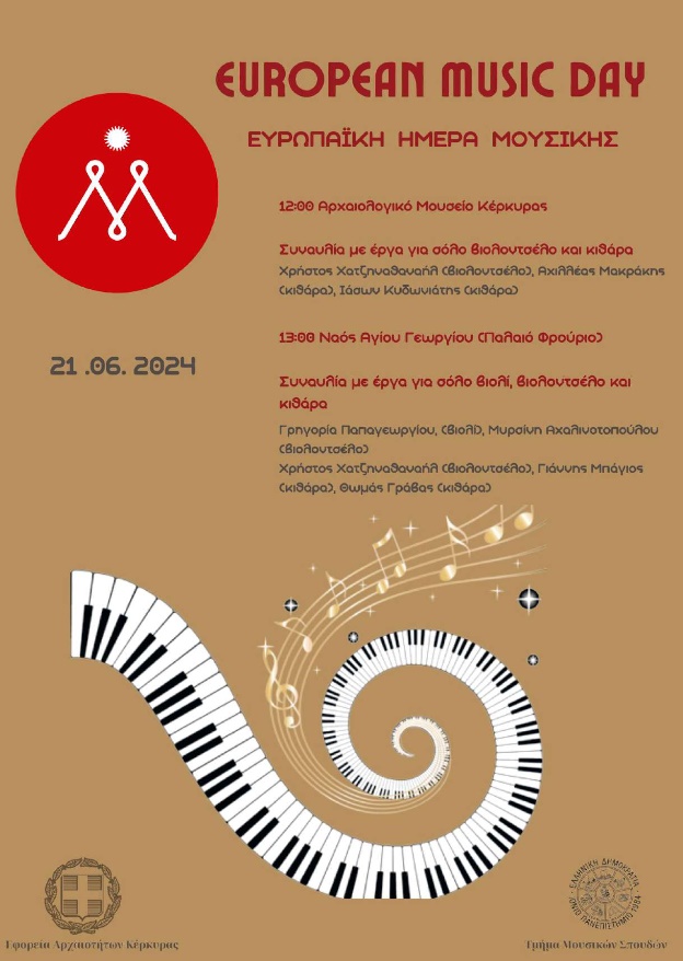 Η Εφορεία Αρχαιοτήτων Κέρκυρας σε συνεργασία με το Τμήμα Μουσικών Σπουδών του Ιονίου Πανεπιστημίου συμμετέχει στις εκδηλώσεις για τον εορτασμό της Ευρωπαϊκής Ημέρας Μουσικής, την Παρασκευή 21 Ιουνίου 2024, με δύο συναυλίες κλασικής μουσικής.