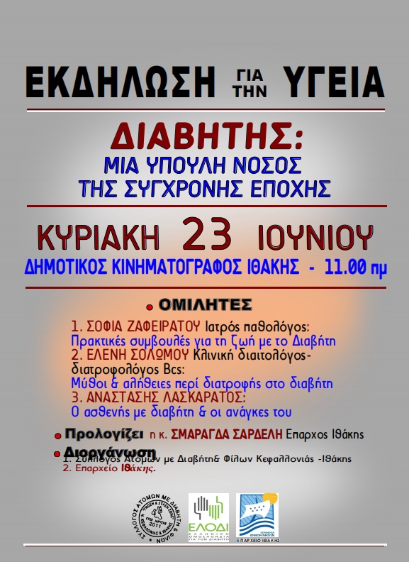 Ο Σύλλογος ατόμων με διαβήτη και φίλων Κεφαλλονιάς και Ιθάκης, “Γνώση & στάση Ζωής” και η ΕΛ.Ο.ΔΙ (Ελληνική Ομοσπονδία για το Διαβήτη), υπό την αιγίδα του Επαρχείου Ιθάκης, σας καλούν: την ΚΥΡΙΑΚΗ 23 ΙΟΥΝΙΟΥ και ώρα 11.00 πμ στο Δημοτικό Κινηματογράφο Ιθάκης στην εκδήλωση με θέμα: “ΔΙΑΒΗΤΗΣ: ΜΙΑ ΥΠΟΥΛΗ ΝΟΣΟΣ ΤΗΣ ΕΠΟΧΗΣ”