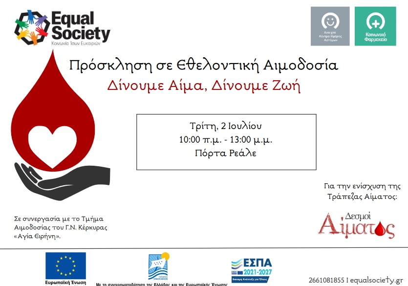Ο Οργανισμός Equal Society, όπως πάντα παρών, σε δράσεις αλληλεγγύης απευθύνει έκκληση να σταθείτε στο πλευρό του στην εθελοντική αιμοδοσία που διοργανώνει στις 2 Ιουλίου μαζί με το Τμήμα Αιμοδοσίας του Γ.Ν. Κέρκυρας «Αγία Ειρήνη».