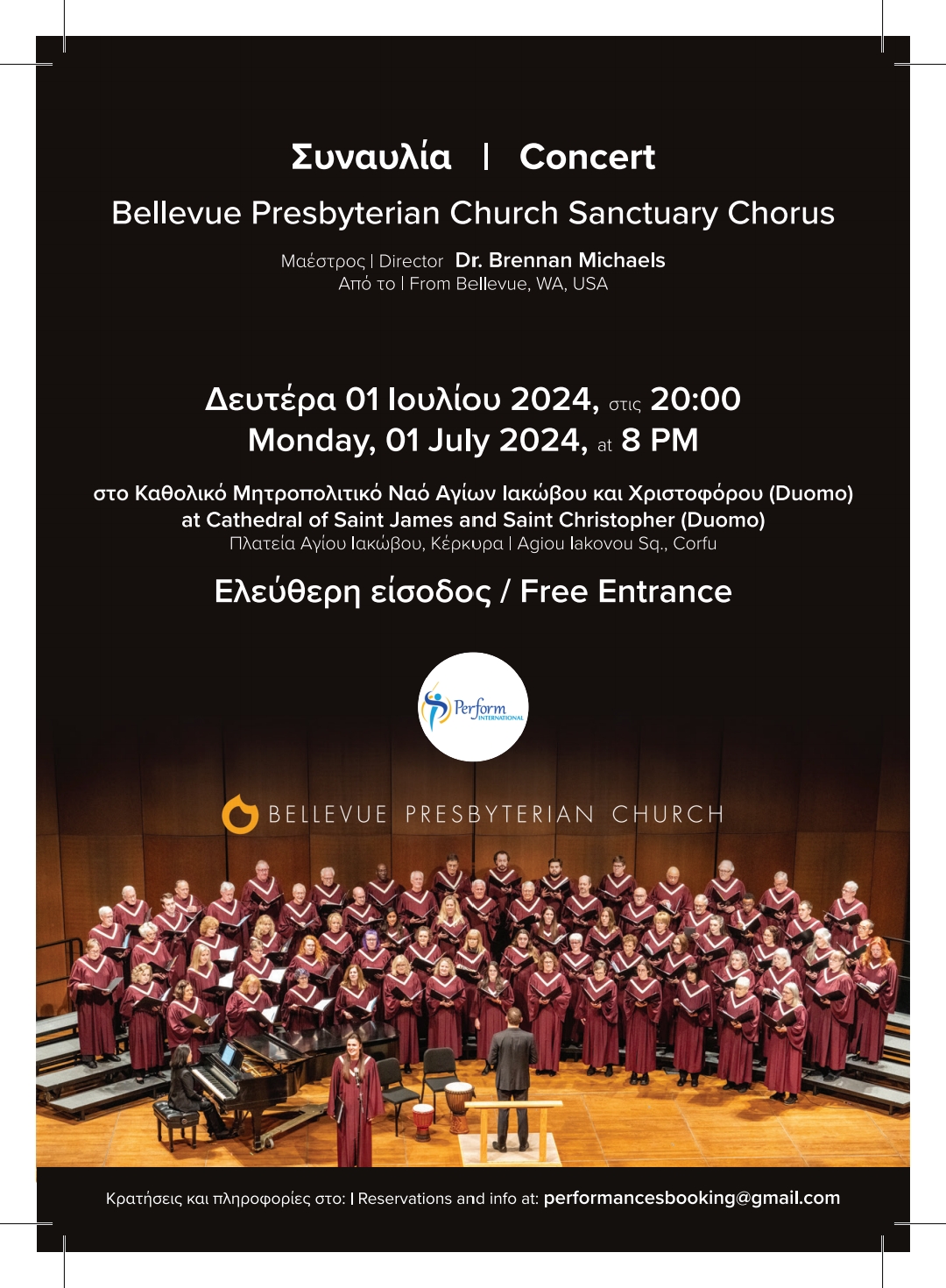 Στα πλαίσια περιοδείας και επίσκεψης για πρώτη φορά στην Ελλάδα της χορωδίας ενηλίκων Bellevue Presbyterian Church Sanctuary Chorus από τις ΗΠΑ, με μαέστρο τον Brennan Michaels, θα πραγματοποιηθεί χορωδιακή συναυλία την 1η Ιουλίου, ημέρα Δευτέρα και ώρα 8:00 μ.μ., στον Καθολικό Μητροπολιτικό Ναό Αγίων Χριστοφόρου και Ιακώβου (Duomo).