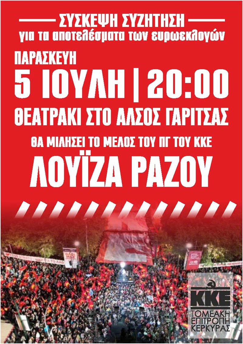 Η Τομεακή Επιτροπή Κέρκυρας του ΚΚΕ διοργανώνει σύσκεψη – συζήτηση για το αποτέλεσμα των ευρωεκλογών την Παρασκευή 5 Ιούλη στις 20:00 στο Θεατράκι στο Άλσος Γαρίτσας. Θα μιλήσει η Λουΐζα Ράζου, μέλος της Πολιτικού Γραφείου της Κεντρικής Επιτροπής του ΚΚΕ.