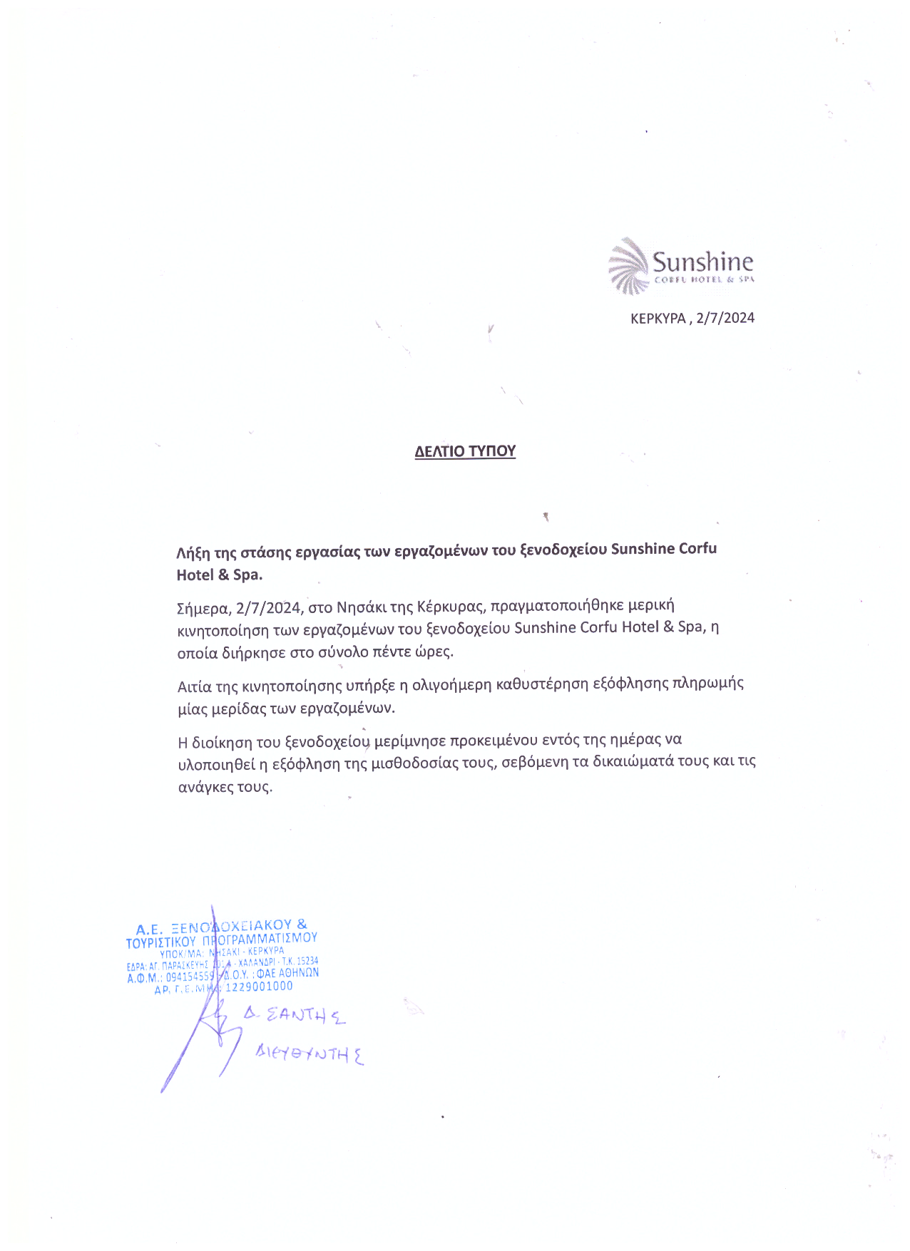 Με ανακοίνωσή της, η ιδιοκτησία του ξενοδοχείου ενημερώνει ότι πληρώθηκαν τα δεδουλευμένα των εργαζομένων και έλαβε τέλος η στάση εργασίας που πραγματοποίησαν.