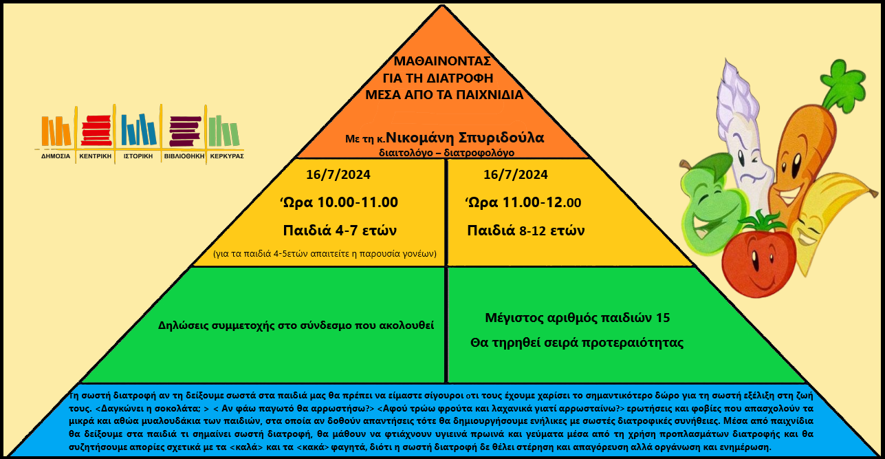 Η Δημόσια Κεντρική Ιστορική Βιβλιοθήκη Κέρκυρας σας καλεί στη δράση: ΜΑΘΑΙΝΟΝΤΑΣ ΓΙΑ ΤΗ ΔΙΑΤΡΟΦΗ ΜΕΣΑ ΑΠΟ ΤΑ ΠΑΙΧΝΙΔΙΑ με τη διαιτολόγο – διατροφολόγο Νικομάνη Σπυριδούλα