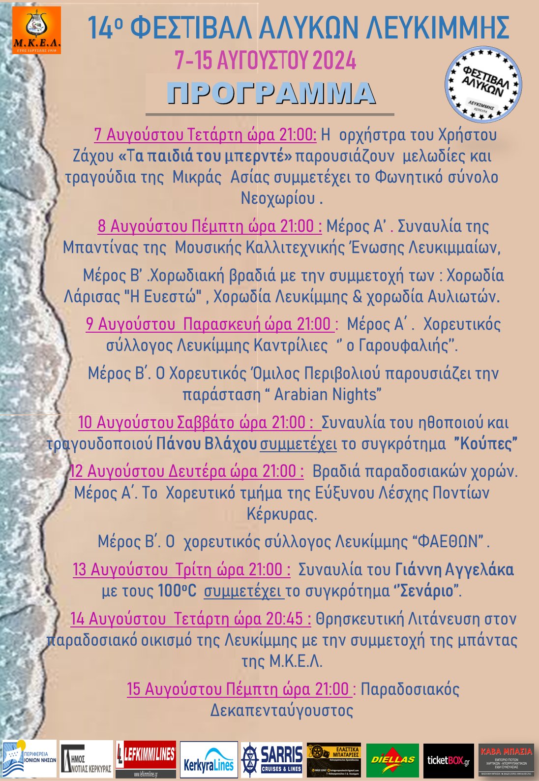 ΠΟΛΙΤΙΣΜΟΣ - ΕΚΔΗΛΩΣΕΙΣΕΙΔΗΣΕΙΣCULTURE Το πρόγραμμα του 14ου Φεστιβάλ Αλυκών Λευκίμμης Το 14ο Φεστιβάλ Αλυκών Λευκίμμης θα ξεκινήσει στις 7 Αυγούστου και θα ολοκληρωθεί τον Δεκαπενταύγουστο. Last updated: 09/07/2024 11:06 CorfuPress.com Published: 09/07/2024 Share SHARE Το 14ο Φεστιβάλ Αλυκών Λευκίμμης θα ξεκινήσει στις 7 Αυγούστου και θα ολοκληρωθεί τον Δεκαπενταύγουστο. Φεστιβάλ Αλυκών: Γιοκαρίνης, Ζιώγαλας, Καζούλης, Παπαδόπουλος, Τσακνής, Θηβαίος, Μουζουράκης! Με Πυξ Λαξ και Πασχάλη το Φεστιβάλ Αλυκών Λευκίμμης Μουσική Καλλιτεχνική Ένωση Λευκιμμαίων: Γι’ αυτό ακυρώθηκε το 11ο Φεστιβάλ Αλυκών Share This Article Facebook Whatsapp Whatsapp Email Copy Link Print Previous Article ΔΕΥΑΚ – Φράγματα – Νερό από την Αλβανία Next Article Νερό: “Κλείδωσε” Σαγιάδα με φράγμα και υδροηλεκτρικό; Δεν υπάρχουν Σχόλια Δεν υπάρχουν Σχόλια Αφήστε μια απάντηση Ακύρωση απάντησηςΗ ηλ. διεύθυνση σας δεν δημοσιεύεται. Τα υποχρεωτικά πεδία σημειώνονται με *Σχόλιο * Όνομα * Email * Ιστότοπος Αποθήκευσε το όνομά μου, email, και τον ιστότοπο μου σε αυτόν τον πλοηγό για την επόμενη φορά που θα σχολιάσω. ΑναζήτησηΑναζήτησηRecent PostsΌλα τα μάτια στον Θοδωρή, τον καπετάνιο μας! Τη Δευτέρα 22 Σεπτεμβρίου γιορτάζει… Σαν Σήμερα 22/9: Τα σημαντικότερα γεγονότα… Η πρόγνωση του καιρού Έφηβοι Ιονίου: Με περίπατο, συνεχίζουν στο Rising Stars! Recent CommentsΧωρίς σχόλια για εμφάνιση.