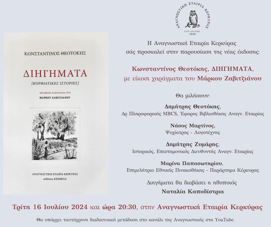 Η Αναγνωστική Εταιρία Κερκύρας διοργανώνει την παρουσίαση της νέας της συν-έκδοσης, με τις εκδόσεις ΚΕΙΜΕΝΑ: Κωνσταντίνος Θεοτόκης, ΔΙΗΓΗΜΑΤΑ, με είκοσι χαράγματα του Μάρκου Ζαβιτζιάνου.