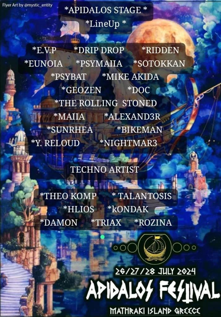 Στη σκηνή Απήδαλος θα εμφανιστούν ταλέντα όπως ο E.V.P από την Wildthings Records (UK), οι DRIP DROP, RIDDEN, DOC και EUNOIA από την Harmonia Records (GR), οι PSYMAIIA, SOTOKKAN, PSYBAT, MIKE AKIDA και Y.RELOUD από το Free Earth Festival (GR), η MAIIA από τη Mystic Sound Records (GR), ο GEOZEN από την Underground Experience Record, οι THE ROLLING STONED από τη Spiral Trax, ο ALEXAND3R Alfios Gathering από την Orphic Resonance (GR), οι SUNRHEA και BIKEMAN από το Green Life (GR), και ο NIGHTMAR3 από το Φεστιβάλ Απίδαλος (GR).