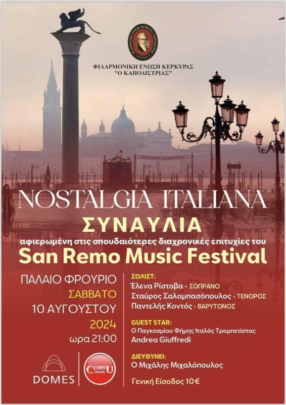 Συναυλία υπο τον τίτλο “Nostalgia Italiana” αφιερωμένη στις διαχρονικές επιτυχίες του San Remo Music Festival, θα δοθεί στις 10 Αυγούστου στο Παλαιό Φρούριο με τη σύμπραξη της Φιλαρμονικής «Καποδίστριας».
