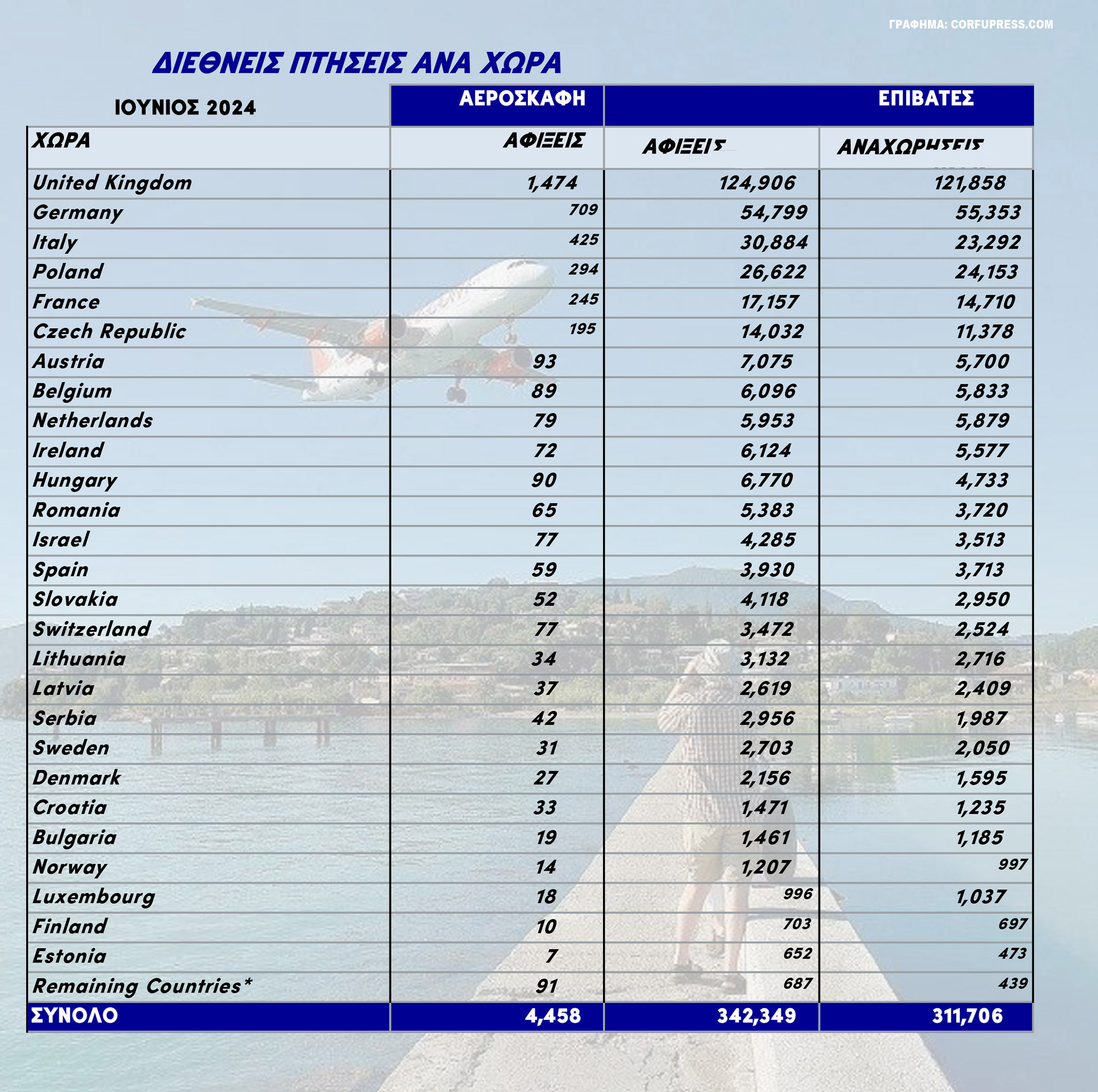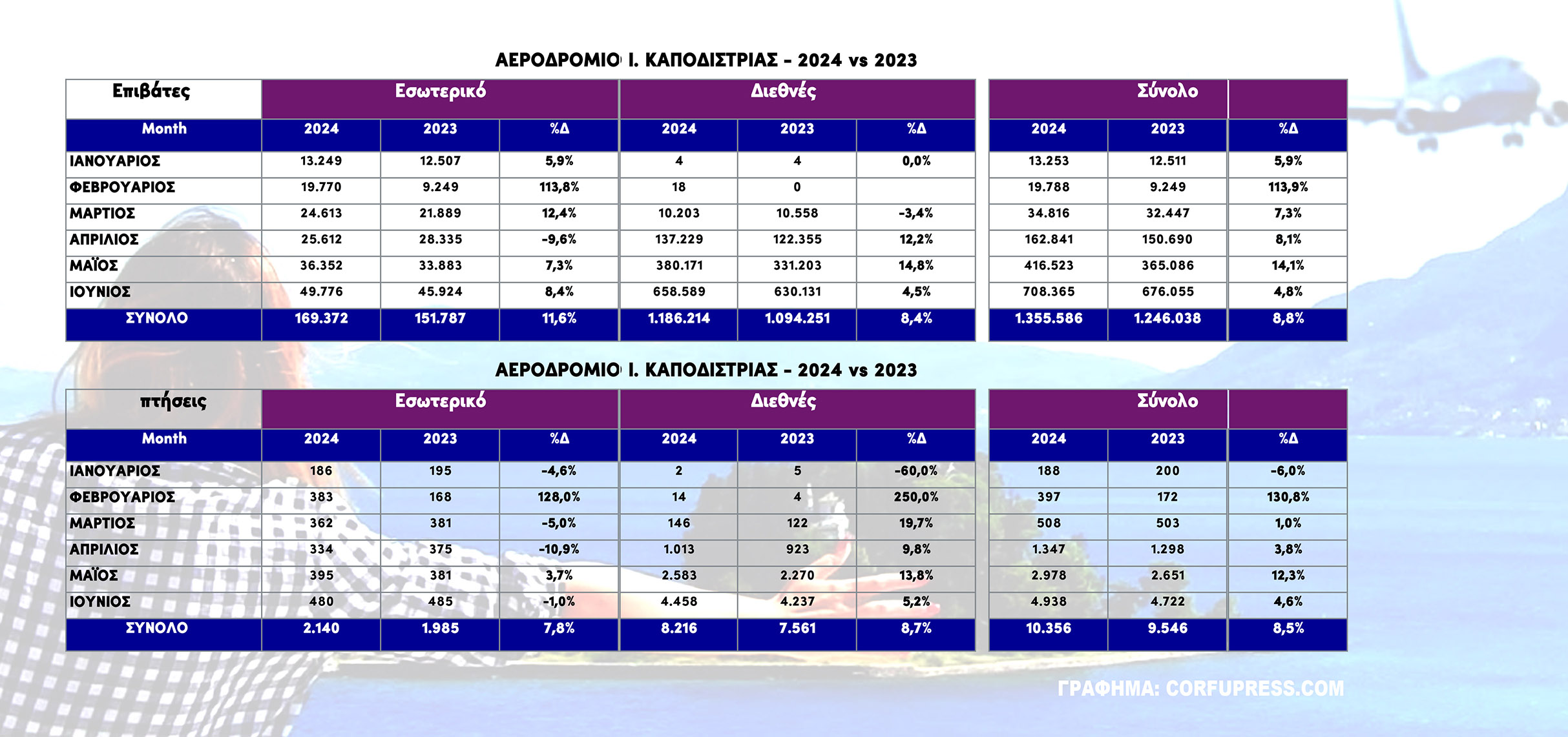 Με μία αύξηση της τάξεως του 4,5% έκλεισε ο Ιούνιος στο αεροδρόμιο της Κέρκυρας όσον αφορά τις διεθνείς αφίξεις, σε σχέση με τον αντίστοιχο μήνα του 2023, ενώ συνολικά οι επιβάτες για το πρώτο εξάμηνο του έτους σε σχέση με πέρυσι αυξήθηκαν κατά 8,4%.