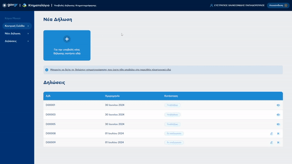 - Επίσκεψη στο https://dilosi.ktimatologio.gr, σύνδεση με κωδικούς taxisnet και δημιουργία νέας δήλωσης
