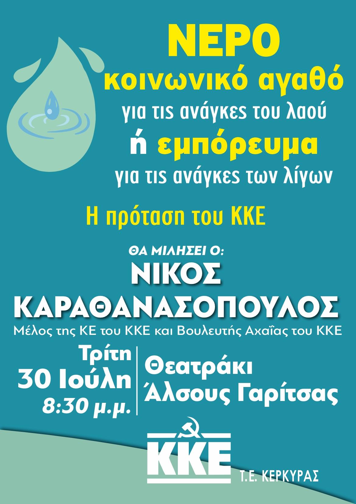 Η Τομεακή Επιτροπή Κέρκυρας του ΚΚΕ διοργανώνει την Τρίτη 30 Ιουλίου, στις 8.30μ.μ. εκδήλωση – συζήτηση στο Θεατράκι του Άλσους Γαρίτσας με θέμα: “ΝΕΡΟ, κοινωνικό αγαθό για τις ανάγκες του λαού ή εμπόρευμα για τις ανάγκες των λίγων; Η πρόταση του ΚΚΕ”. Θα μιλήσει ο Νίκος Καραθανασόπουλος, μέλος της Κεντρικής Επιτροπή του ΚΚΕ και βουλευτής του Κόμματος.
