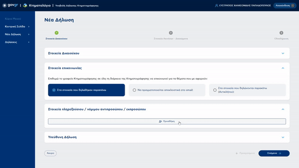 Δεύτερον, ο χρήστης συμπληρώνει τα προσωπικά του στοιχεία, δηλώνει εάν επιθυμεί πληρεξούσιο και αποδέχεται μέσω υπεύθυνης δήλωσης την εγκυρότητα της δήλωσης του ακινήτου του και των σχετικών στοιχείων.